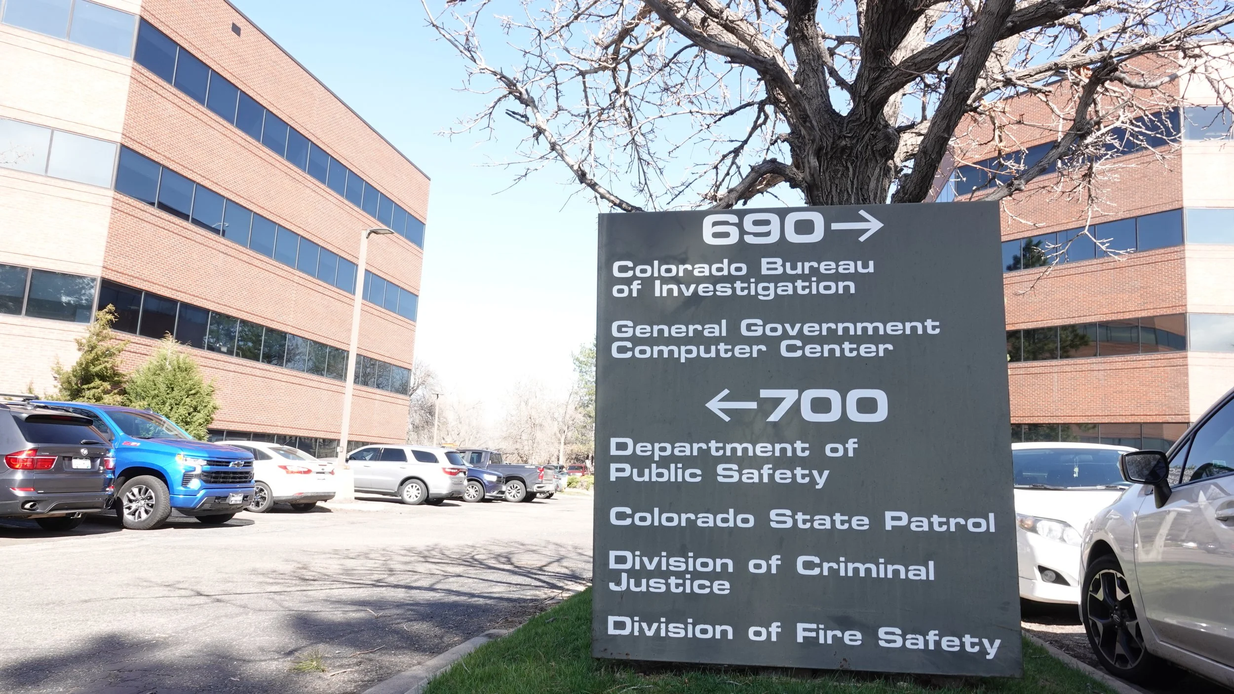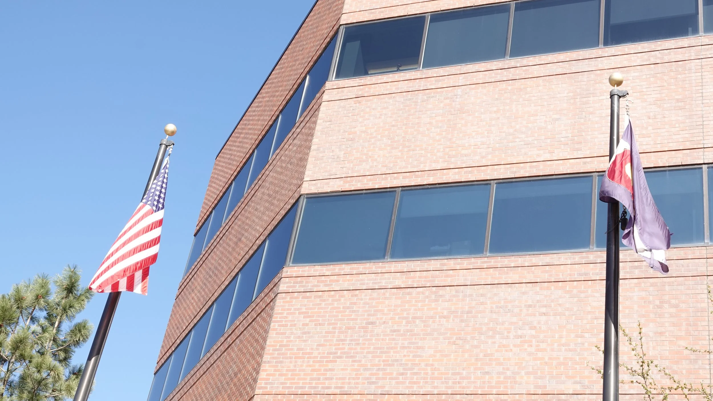 Flags of the United States and the state of Colorado fly outside the Division of Criminal Justice in Denver, Colorado on April 15, 2024.